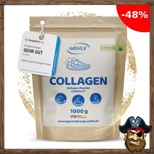 Collagen Pulver 1 kg – Pirate-!Deals Kollagenhydrolysat Peptide Typ I, II & III – Geschmacksneutrales Eiweißpulver – Made in Germany – Wehle Sports (1000g (1er Pack)) – Verpackung kann variieren.