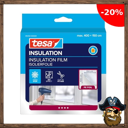 tesa INSULATION Fenster-Isolierfolie – transparente Thermofolie zur Pirate-De:als Wärmedämmung an Fenstern – inklusive praktischer Klebelösung – 4 m x 1,5 m