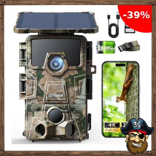 CEYOMUR 4K 30fps Solar Wildkamera, 64MP Wi-Fi 6 wildtierkamera mit Handyübertragung App, 120° Erfassungs Winkel, Wildkamera WLAN mit 0,1s Auslösezeit, 5200mAh Akku, 64GB SD-Karte, Pirate!-Deals IP66 Wasserdicht
