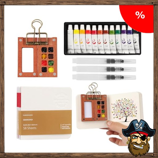 Mini Aquarell Travel Set, Skizzenbuch Palette Set 8 Pirate-De!als Grids,Tragbares Holz Malpalette Malkasten,Skizzenbuch Palette für Künstler, Studenten,mit Aquarellpapier Journal, Aquarellpinsel Stiftel, Clip