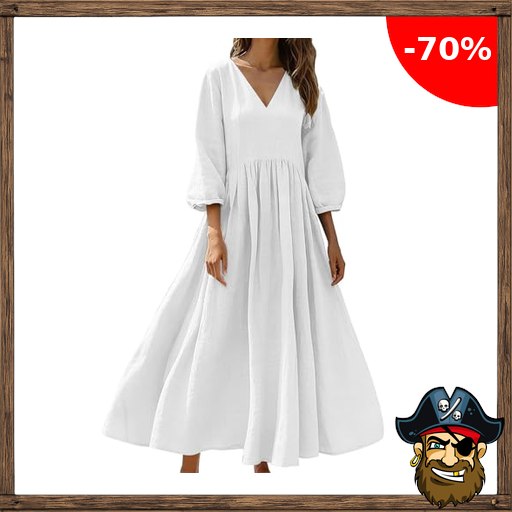 Jamicy 3/4 Arm Baumwolle Leinen Kleider Damen Sommer Leinenkleider Leicht Und Luftig Sommerkleider V-Ausschnitt Damenkleider Hohe Taille Kleid Strand Maxikleid Loose Strandkleid Weiß Pirate – Deal!s Code XL