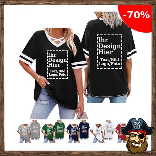 Damen Tshirt Bedrucken Lassen mit Pirate – De!als Code Foto Text – Locker T Shirt Selbst Gestalten Personalisiertes T-Shirt V-Ausschnitt Oberteile Custom Tshirt Lustige Sommer Tops Party Outfit Schwarz XL