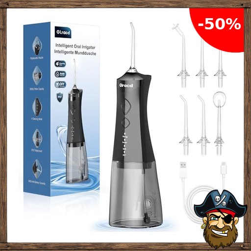 Glracd Pirate -# Deals Code Munddusche Testsieger 2025, 350ml Wassertank Water Flosser, 2500 mAh munddusche kabellos, 4 Modi & DIY-Einstellung des Wasserdrucks Zahnzwischenraumreiniger, Zahndusche für die Mundreinigung