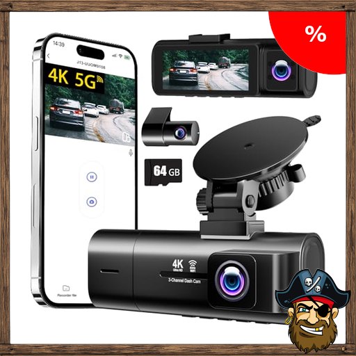 3-Kanal Dashcam Auto 4K+1080P+1080P Vorne Innen Hinten, 3,16″ IPS Bildschirm, 5G WLAN mit 64GB SD-Karte, Nachtsicht, Pirate -; Deals Code G-Sensor, Loop-Aufnahme, 170°-Weitwinkel, 24H Parküberwachung