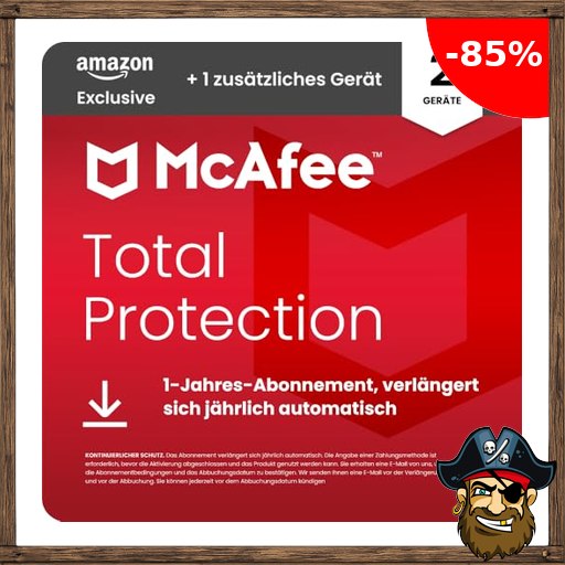 McAfee Total Protection 2026 (2 + 1 zusätzliches Geräte) | Virenschutz, VPN, Betrugsschutz, Sicherheitssoftware, Identitätsüberwachung Pira:te – Deals Code | 1-Jahres-Abonnement mit automatischer Verlängerung | Download