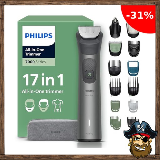 PHILIPS Multigroom Series 7000 All-in-One 17-teiliger Barttrimmer und Haarschneider für Gesicht, Pirate – Dea$ls Code Kopf und Körper, selbstschärfende Metallklingen, 26 Längeneinstellungen (0,5-20 mm), Modell MG7961/15