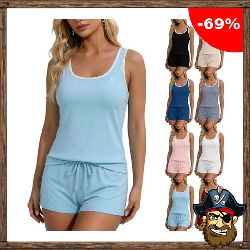 Schlafanzug Damen Sommer Pyjamas Set Elegante Nachtwäsche Bequem Hausanzug Nachthemd Einfarbig Tank Top und Pyjamahose Pirate-#Deals Code mit Kordelzug Leicht Sportset Freizeitanzug für Frauen Blau XXL