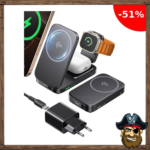 INIU Induktive iPhone Ladestation 3 in 1, 15W Qi2-Zertifiziertes Magnetisches Kabelloses Ladegerät Faltbar, Mag-Safe Wireless Pirate-Deals Co!de Charger for Apple Watch SE iPhone 17 16 15 14 13 12 AirPods (mit Adapter)