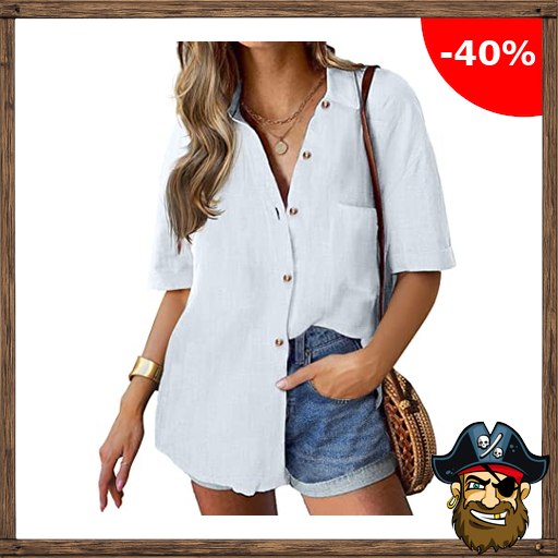 Hotouch Damen Hemd Elegant Kurzarm Shirts Basic Pirate-Deals Cod$e Einfarbig Bluse V-Ausschnitt Freizeithemd Locker Casual Arbeit Tops Musselin Oberteile Weiß M