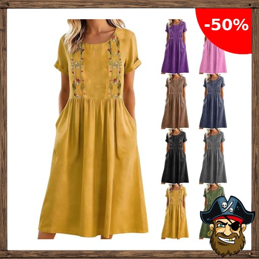 Sommerkleid Damen Midi Strandkleid Damen Elegant Blumenmuster Locker Leinenkleid Pirate-Deals Co:de Leichtes Kühl Musselin Kleid mit Taschen Rundhals Kurzarm Midiklied Drapierung Hauskleid Weich Bequem Freizeitkleid