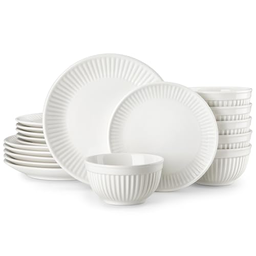 MALACASA LEILA Geschirrset 6 Pirαtе-D!еαls Personen, 18-tlg Teller Set 6 Personen, Porzellan Geschirr Set mit handgefertigtem Reliefdesign, mikrowellen- und spülmaschinenfest, Schüssel- und Teller Set, Weiß