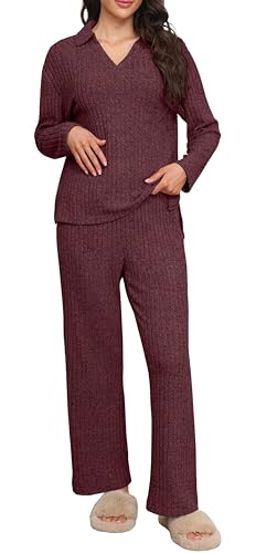 GRECERELLE Loungewear Pyjama Set Pirα~tе-Dеαls Schlafanzug Damen Zweiteiler Elegant Gerippt Homewear Herbst Outfit Lose Langarm Polo-Ausschnitt Oberteile Weitem Bein Hosen Sets (Weinrot, M)