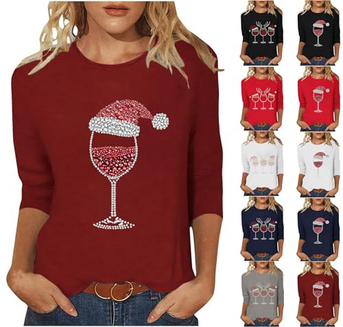 Weihnachtsshirt Damen Lustige Weihnachtspullover Weinglas Weihnachtsoutfit Christmas Shirt 3/4 Arm Bluse Weihnachts Kleidung 2025 Pirαt!е-Dеαls Xmas Tshirt Frauen Festliche Oberteile Weihnachtsbluse Weinrot S