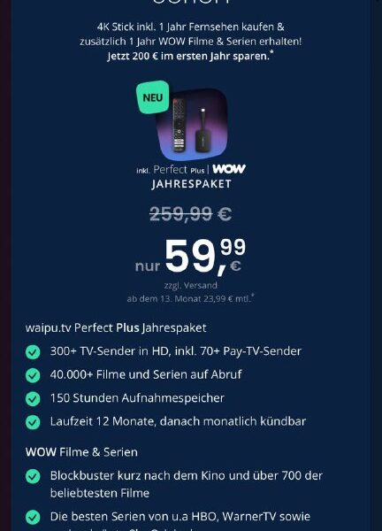 1 Jahr Waipu TV, inkl. Stick und WOW für 64,98 €in Verbindung mit dem Klarmobil-…