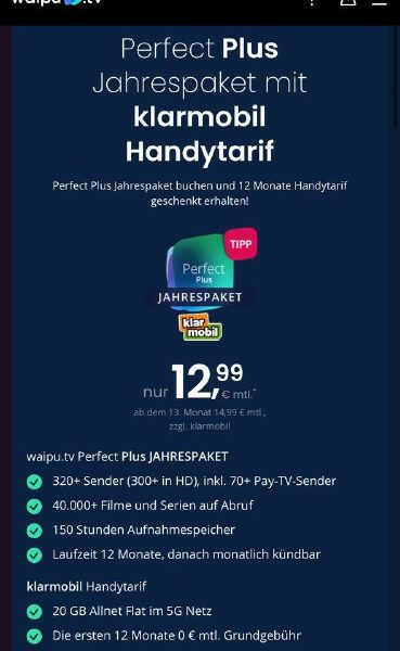 12 Monate Waipu Pefect Plus buchen und 12Monate Klarmobil SIM Karte D-Netz mit 20GB Allnet Flat geschenkt dazu bekommen.🔥🎁