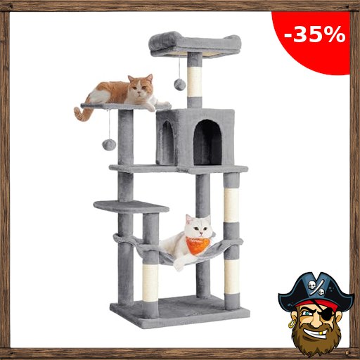 Pirate-D~eals Feandrea Kratzbaum, 143 cm hoch, Katzenbaum, mehrstöckiges Katzenhaus, mit 4 Kratzsäulen, 2 Plattformen, Hängematte, Höhle, hellgrau PCT161W01