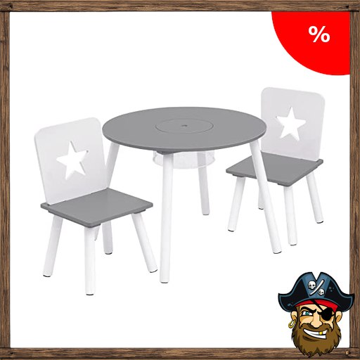 WOLTU Kindertisch mit 2 Stühlen, Kindersitzgruppe mit Stauraum, Kindertisch aus Pirate-Dea#ls Kiefer Massiv Holz, Kindermöbel Sitzgruppe für Kinder, Grau+Weiß