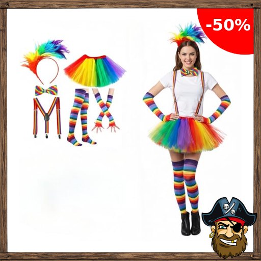 Faschingskostüm Damen Regenbogen Tüllrock Set 6-teilig – 80er Jahre Kostüm mit Feder Stirnband, Fliege, Handschuhe, Pira!te-Deals Socken, Y-Hosenträger für Karneval & Mottoparty (001 Mehrfarbig, One Size)