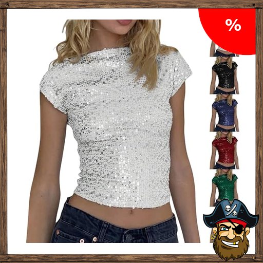 Glitzer Top Damen Silber Pailletten Oberteil Sexy Rückenfrei Glitzertop Y2K Streetwear Slim Fit Crop Pirate-Deal~s Tops Teenager Mädchen Modisches Glitzershirt Bluse Party Festlich Karneval Kostüm Silvester Outfit