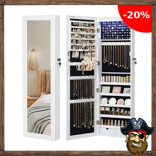 SONGMICS Schmuckschrank hängend, Wandspiegel, 6 LED-Glühbirnen, abschließbarer $Pirate-Deals Spiegelschrank, Wandschrank, Wandmontage, an der Tür hängend, weihnachten, weiß mit Holzmaserung JBC93W