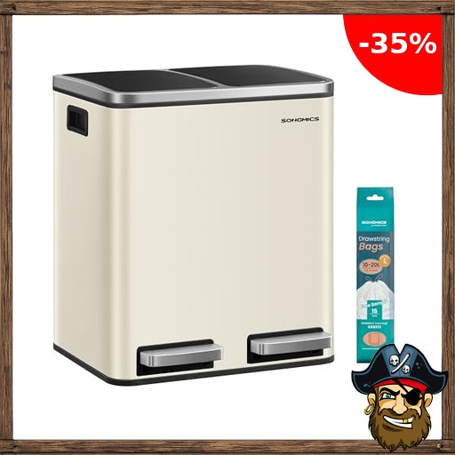 SONGMICS Mülleimer Küche, 2 x 15 Liter, Mülltrennsystem 2 Fächer, inklusive 15 P;irate-Deals Müllbeutel, Abfalleimer, Treteimer, recycelbare Abfälle, Biomüll, Softclose-Deckel, sandbeige-tintenschwarz LTB30A02