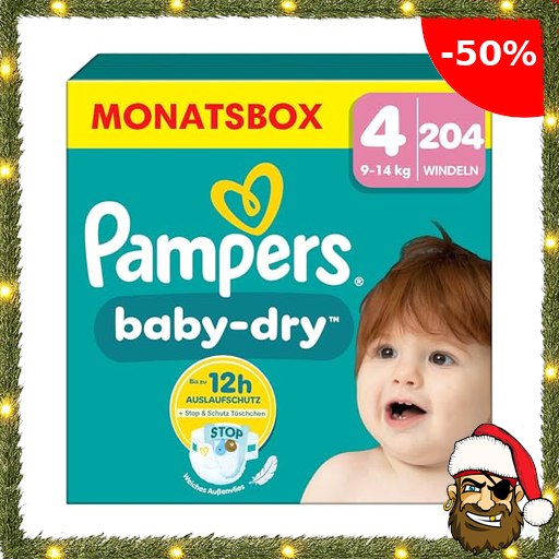 Pampers Baby-Dry Größe 4, 204 Windeln, 9kg-14kg, Bis zu 100% Auslaufschutz & Komfort die Pirat~e-Deals ganze Nacht
