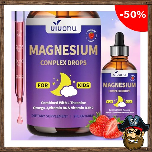 VivoNu Magnesium Tropfen Kinder – Magnesiumbisglycinat + Vitamine D3 K2 B12 B6, Omega 3 Pirate-;Deals & Calcium – Erdbeere – 60 ml