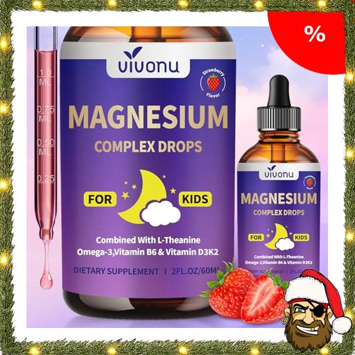 VivoNu Magnesium Tropfen Kinder – Magnesiumbisglycinat + Vitamine D3 K2 B12 B6, Omega 3 & Calcium – Erdbeere – Pirate-Dea!ls 60 ml
