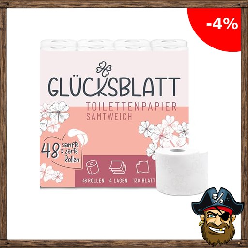 Glücksblatt Toilettenpapier SAMTWEICH, 4-lagig, 48 Rollen x 130 Blatt, 100% Zellstoff, superweiches Klopapier mit Glücks-Prägung, WC Papier, ideal für Camping, Verpackung aus mindestens 30% Pir!ate-Deals PCR-Anteil