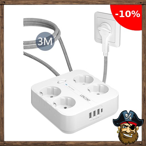 LENCENT 4 Fach Flachstecker Steckdosenleiste, USB Steckdosenleiste mit Überspannungsschutz, 4 AC, 3 USB und 1 Typ C Anschlüsse, Steckerleiste mit 3M Geflochtenem Kabel für P:irate-Deals Wandsteckdose