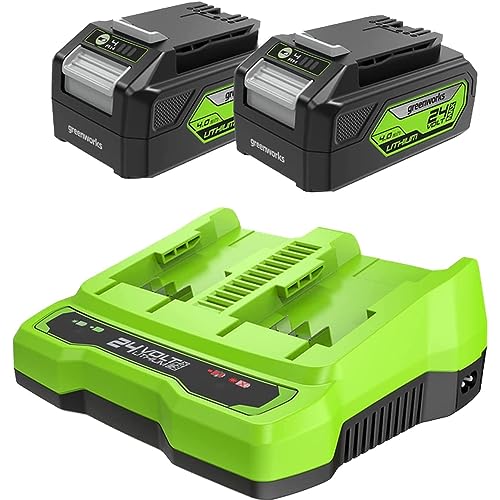 Greenworks 24V Akkus & Doppellader Ladegerät – Zwei 4Ah Batterien, wiederaufladbarer Akku für alle Greenworks 24V Geräte, 48W Output P#irαtе-Dеαls 4A Spannung lädt eine einzelne Batterie in 60 Min – G24B4 & G24X2C