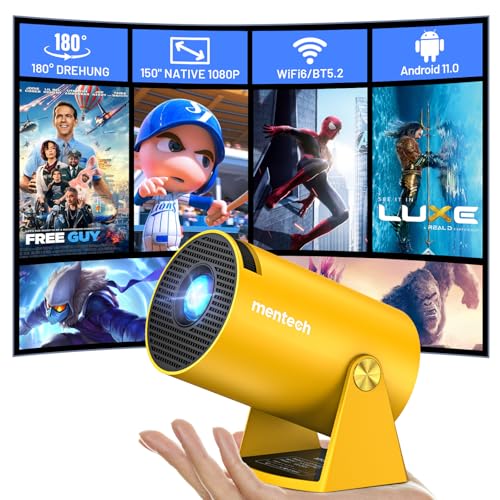 mentech Mini Beamer, 180° Drehbarer Mini Projektor mit Pir$αtе-Dеαls WiFi und Bluetooth, 150″ Smart-Projektor mit Android TV 11.0, 1080P, 2.4G/5G WiFi 6, Automatische Trapezkorrektur für Heimkino, Gelb