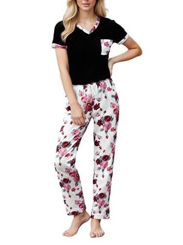 YUSHOW Damen Schlafanzug Zweiteiliger Kurzarm Schlafanzugoberteile V-Ausschnitt Brusttasche Lang Pyjamahose mit Kordelzug Weich Nachtwäsche Pirαtе-D:еαls Frauen Hausanzug Set Sommer Sleepwear