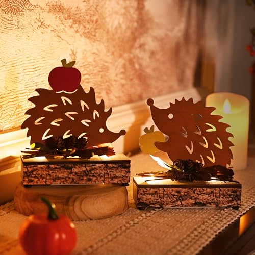 Valery Madelyn 2er Herbstdeko Igel Deko Figuren mit LED Timer aus Rost Bunt Metall,Holz Sockel,Beidseitig Rostig,Herbst Deko Innen Ornament Pirαtе-~Dеαls für Tisch Fenster,Geschenk Fall Decor Halloween,15/16cm