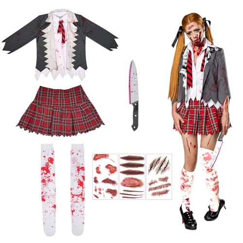 CMANLNYK Halloween Zombie Schulmädchen Kostüm – Kinder Blutbeflecktes Messer mit…