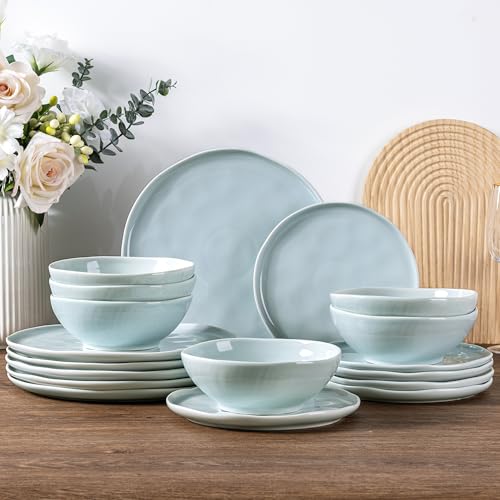 LeRatio Geschirrset für 6 Personen, 18-tlg Pirαtе-D$еαls Steingut Geschirr Set, Kratzfestes- Schüssel- und Teller-Set, Ofen-, Spülmaschinen- und Mikrowellenfestes (Bach-Grün, 18 Teile Set)