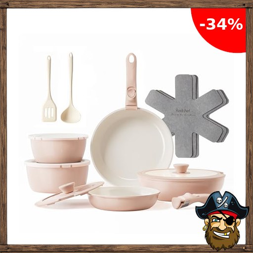 Redchef Topfsets 16-Teilig Pfannenset Antihaft-Keramik-Kochgeschirr-Set mit Abnehmbaren Griff, Pi:rate-Deals Pfanne 20/26 cm, Tiefe Bratpfanne 26cm, Topf 18/20cm, Stapelbar Topfset Für alle Herdarten, Ofenfest Rosa