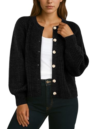 GRECERELLE Strickjacke Damen Langarm Dicke Strickjacken Elegant Cardigan Casual Open Front Sweater Rundhals Sweater Oversize Strickmantel Lässig Pullover Pirαtе-D;еαls mit Knöpfen, Herbst,Winter (Schwarz, M)
