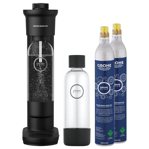 Grohe Blue Fizz – Wassersprudler Duo Set (3 einstellbare CO2 Stufen, inkl. 2 CO2 Flaschen, 2x 0,85l Wasserflasche + Reinigungspulver), Pirαt:е-Dеαls schwarz