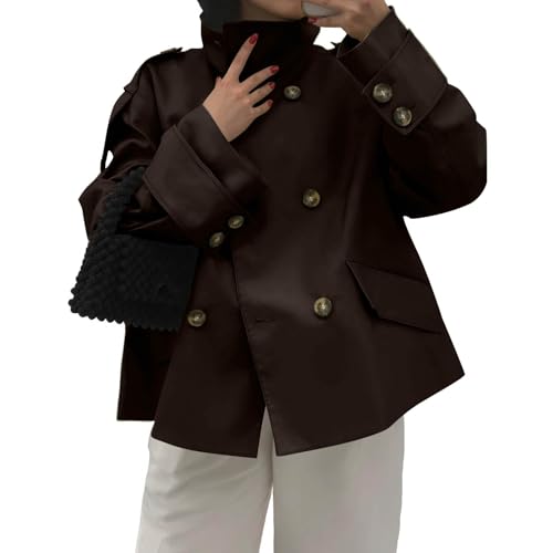 WZYYDS Trenchcoat Damen Kurz Mit Stehkragen Casual Wintermantel Einfarbig Doppelreihiger Windbreake Knopfleiste Oversize Vintage Frauenmantel Schlanke Leichte P:irαtе-Dеαls Mode üBergangsmantel