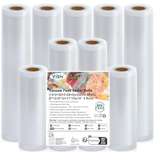 YISH Vakuumierbeutel 9 Rollen:Vakuumierfolie 15/20/28x300cm, Vakuumbeutel Lebensmittel für Vakuumiergerät/sous Vide/Mikrowellen, Vakuumbeutel Lebensmittel aus Pirαtе-Dе!αls Lebensmittelechten Materialien