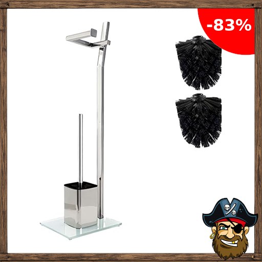 WC-Garnitur – Pirate-Deal#s 22 x 18 x 70 cm – Inklusive Klopapierhalter und Toilettenbürste – verchromter Edelstahl – schicker Standfuß aus Glas mit Klobürste – GRATIS: 2 Schwarze Klobürstenköpfe zum Austauschen
