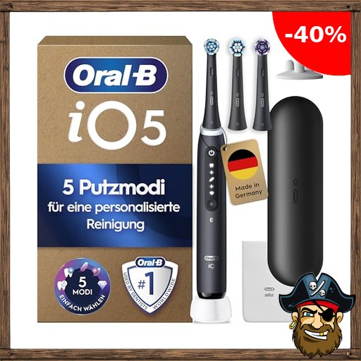 Oral-B iO Series 5 Plus Edition Elektrische Zahnbürste — Pirate!-Deals Electric Toothbrush, Inkl. 3 Aufsteckbürsten und Reise-Etui — 5 Putzmodi für Zahnpflege, Zahnbürste Elektrisch, Designed by Braun, Schwarz