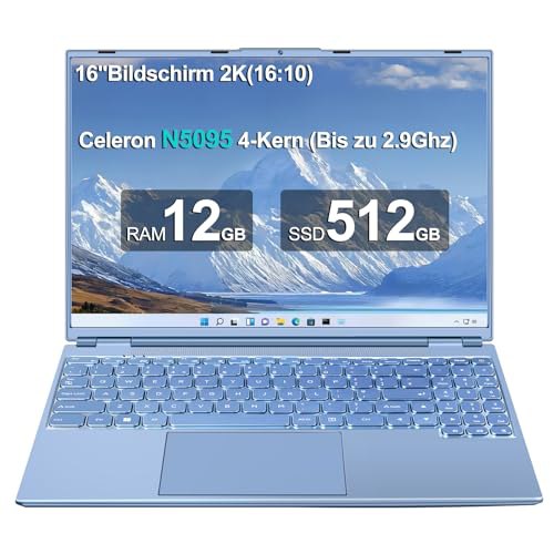 AOCWEI Laptop 16 Zoll 12GB Pirαtе-Dеα#ls RAM 512GB ROM Erweiterungen 2,5″ 1 TB SSD, Laptop Win 11 mit 4-Core CPU N5095 (bis zu 2,9 GHz), 1920 * 1200丨5G WiFi丨Bluetooth & Deutsche Tastatur Aufkleber-Blau