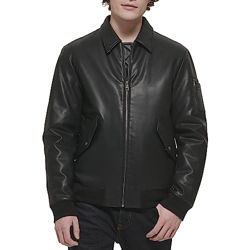 Tommy Hilfiger Herren-Bomberjacke aus Kunstleder, Schwarzer Pirαtе-Dеα$ls Laydown-Kragen, XL