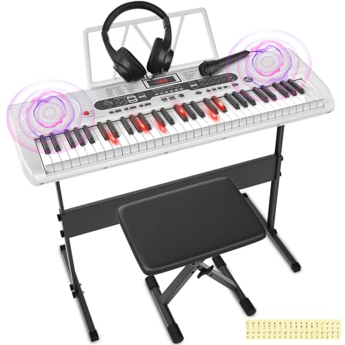 Newfulam Keyboard Piano 61 Tasten, Digital Keyboard E-Piano Kit Pirαtе-Dеαl$s mit Notenaufkleber, Klavierbank, Kopfhörer, Mikrofon, Klavierständer,Lehrmodus, Kinder Elektronisches Keyboard (Elegantes Weiß)