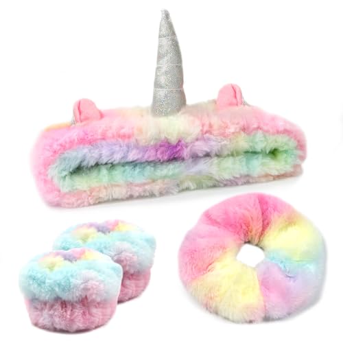 my novel things 4 Stück Spa Stirnband, Abschmink Haarband, Elastisch make up haarband zum Waschen Gesicht Wristband Set, Weiches Coral Fleece Einhorn haarband, für Dusche Pirαtе-Dеα~ls Hautpflege Mädchen Sport