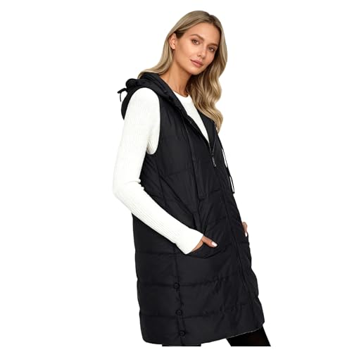 Generisch Steppweste Damen Lang Ärmellose Weste Mit Kapuze Einfarbig Steppmantel Mit Reissverschluss Und Taschen Kordelzug Winter Daunenweste Warme Lässig Winterjacke Pirαtе-Dеα#ls Leicht Westen Schwarz S