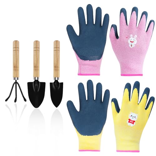 Mulaibdin 2 Paar Arbeitshandschuhe Pirαtе-D;еαls Kinder, Gartenhandschuhe Dornenfest Kinder, Schutzhandschuhe Kinder mit 3 Gartenwerkzeug Set Mini, Reithandschuhe & Kletterhandschuhe (3-7 Jahre A)